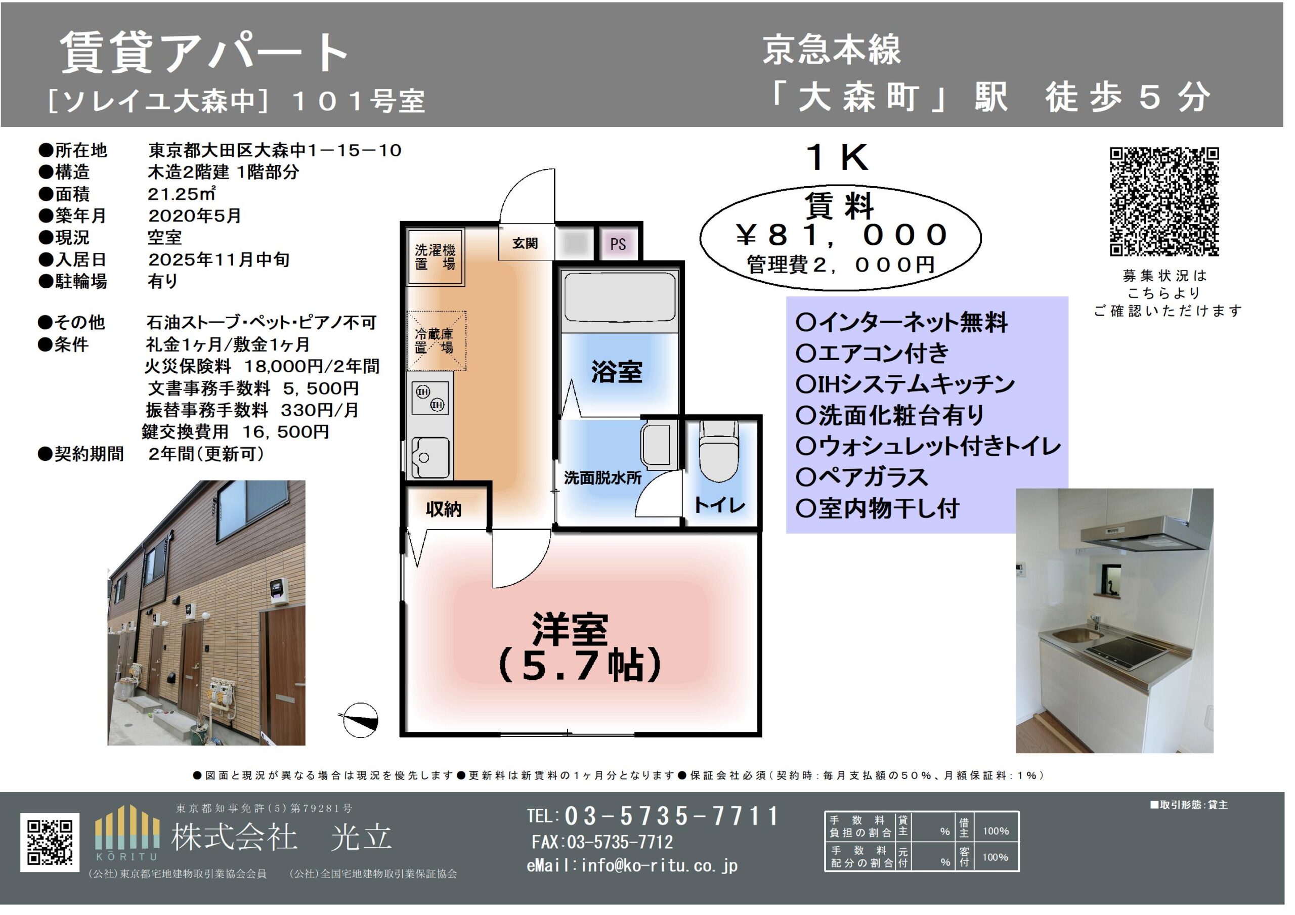 ソレイユ大森中101号室賃貸募集開始いたしました。